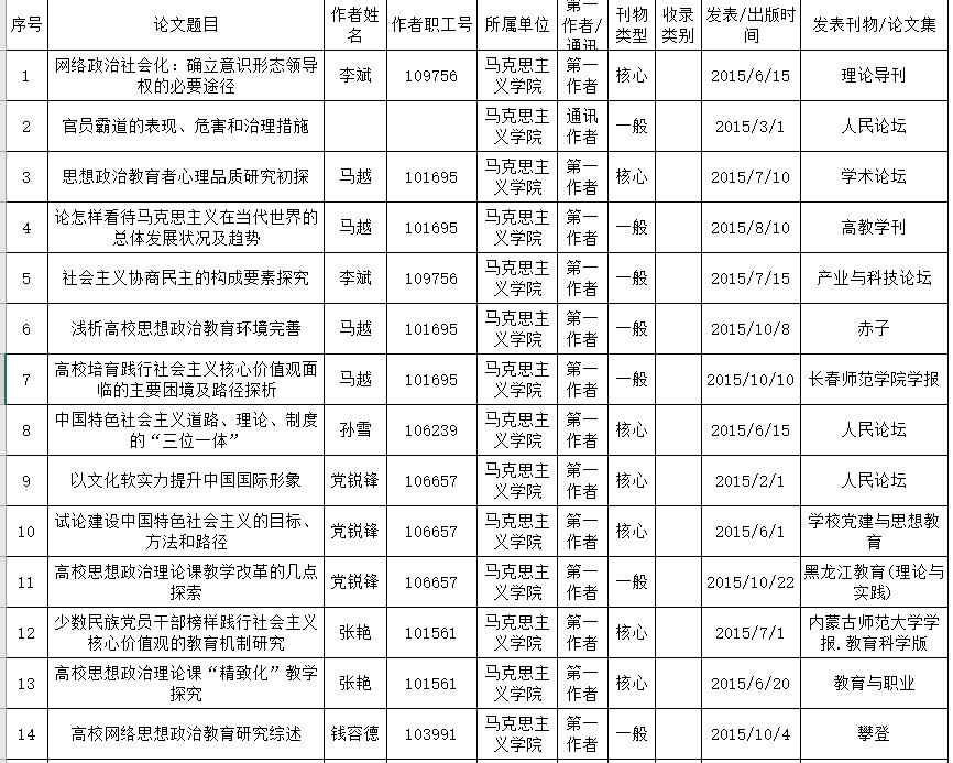 威廉希尔2015年度科研成果【学术论文】统计表(社科类)