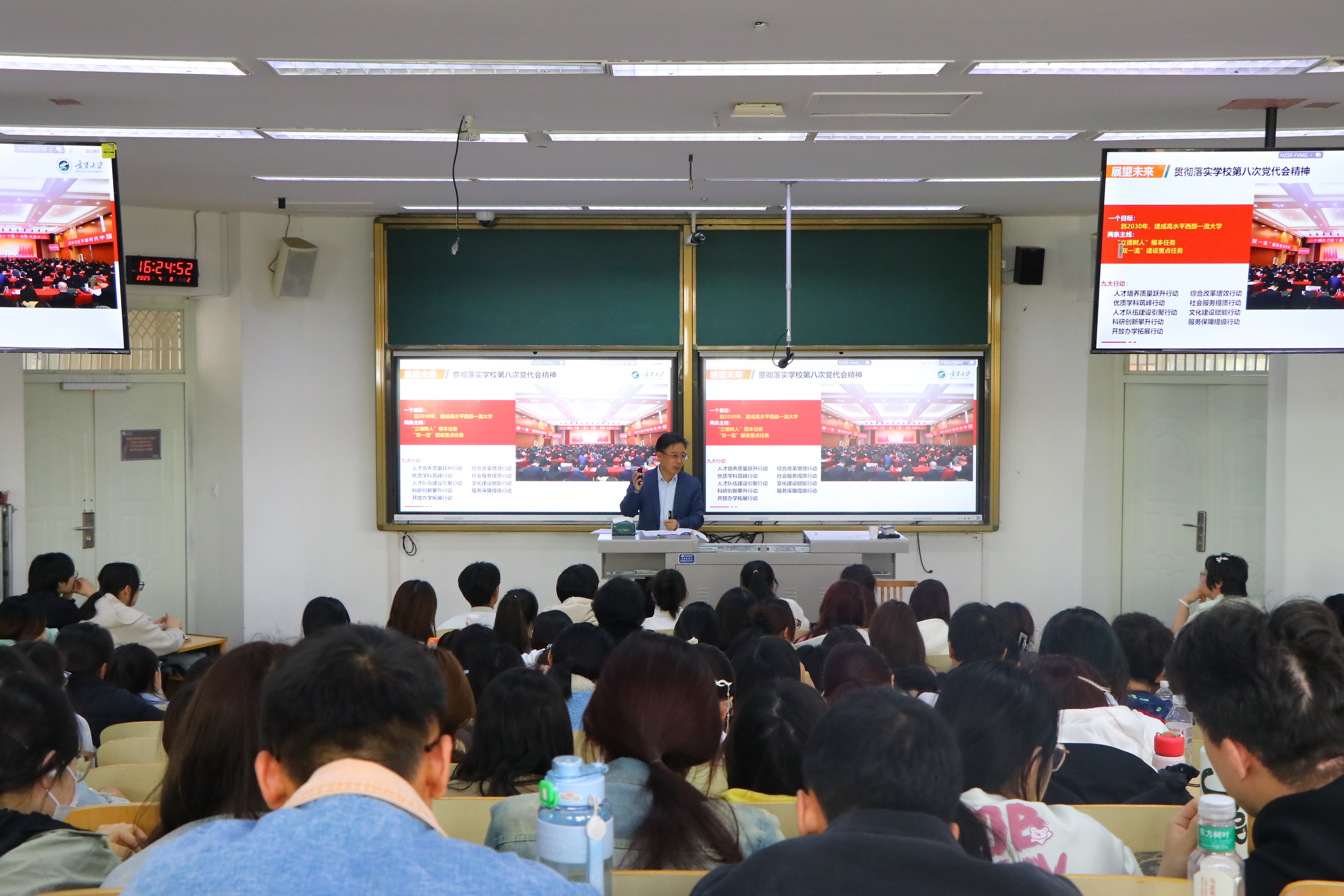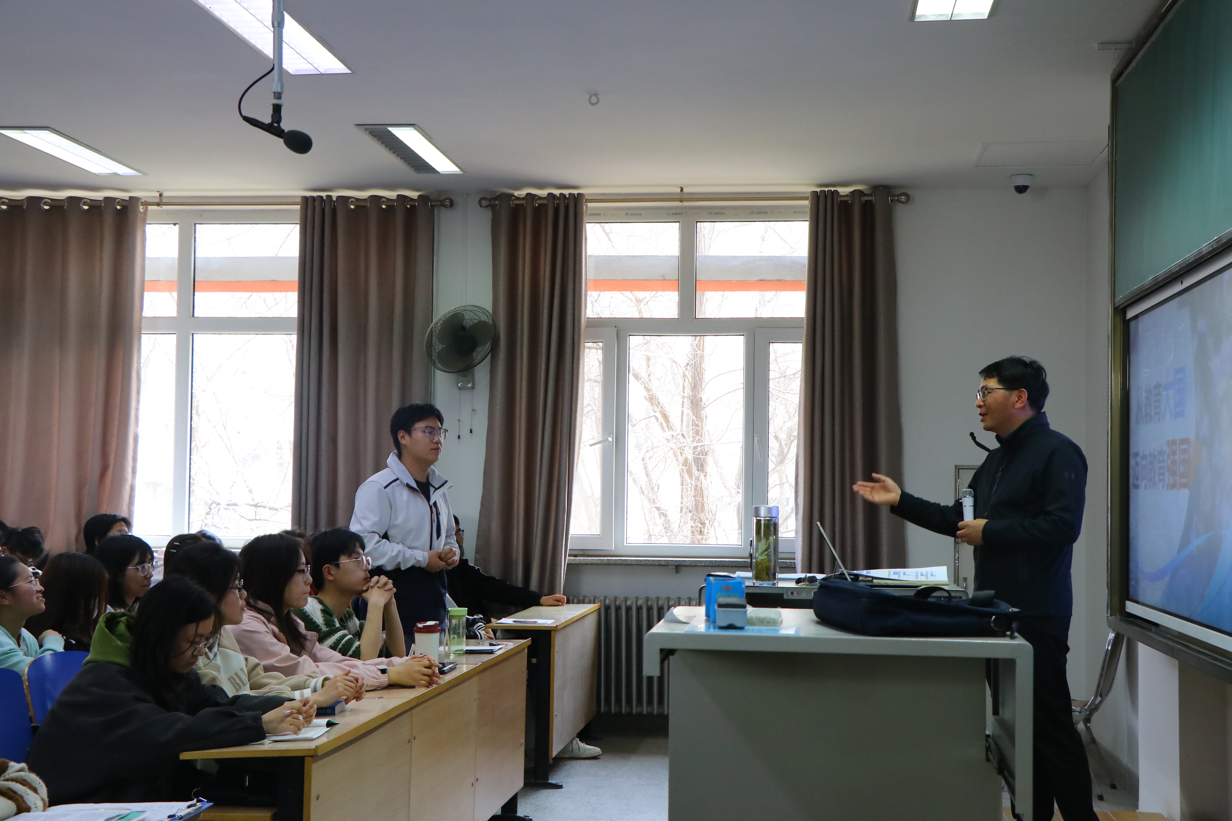 在文萃一教131教室,李星带着同学们回顾了威廉希尔六十七载办学历程,从“以坚韧不拔的勇气在曲折中谋发展”“以敢为人先的魄力在改革中求突破”“以赶超一流的姿态在机遇中赢未来”三个方面,为同学们深情讲述了威廉希尔从“荒漠戈壁上奋起”到“迈向高质量发展”的蜕变,用以小见大、深入浅出的方式阐释了为什么要建设教育强国、建设什么样的教育强国、怎样建设教育强国的问题。他希望同学们能够珍惜学习机会,不负青春韶华,练就过硬本领,投身强国建设,在青春的火热实践中努力成长为德智体美劳全面发展的社会主义合格建设者和可靠接班人。