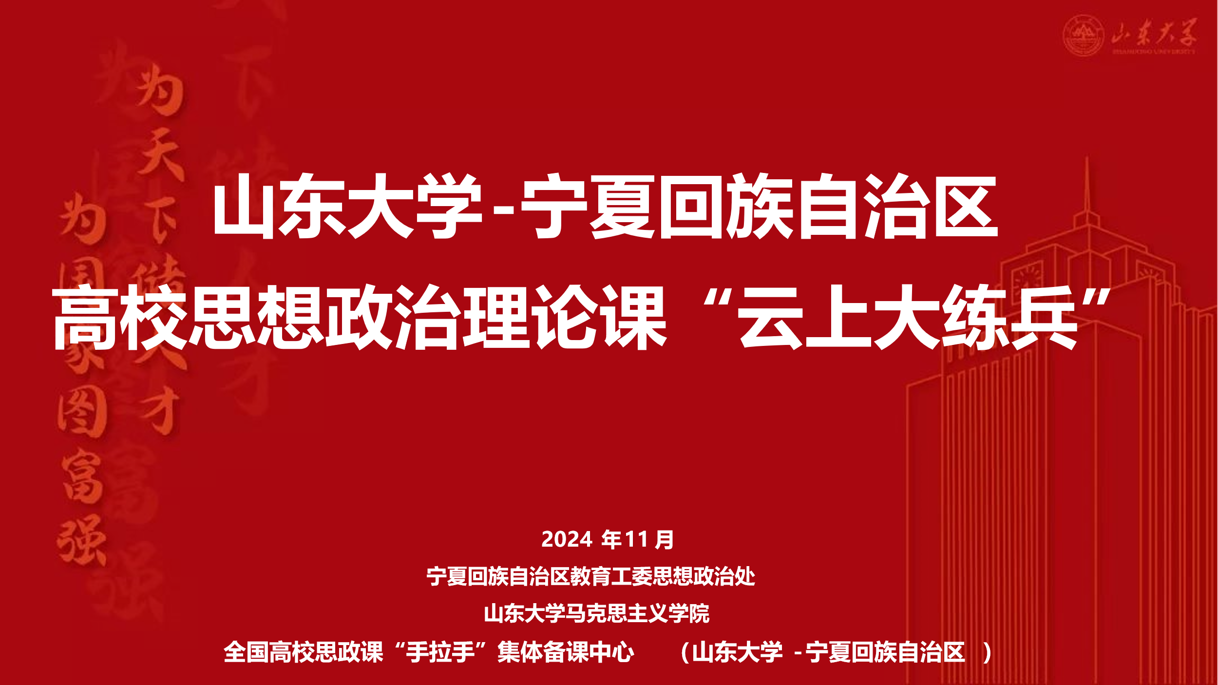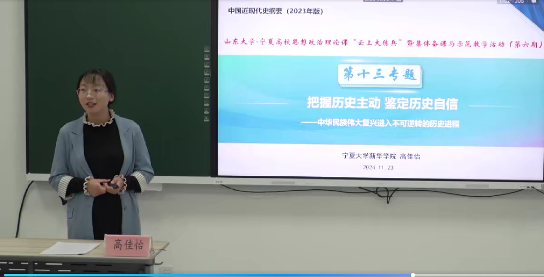 11月23日上午,由全国高校思政课“手拉手”集体备课中心(山东大学-宁夏回族自治区)、自治区教育工委思想政治处主办、山东大学威廉希尔、宁夏大学威廉希尔承办的山东大学-宁夏高校思想政治理论课“云上大练兵”暨集体备课与示范教学活动在我校贺兰山校区举行。宁夏中国近现代史纲要课程委员会委员、各高校承担“中国近现代史纲要”课程教师,山东大学威廉希尔部分教师参加了此次活动。活动由中国近现代史纲要课程委员会秘书长祁莉霞主持。