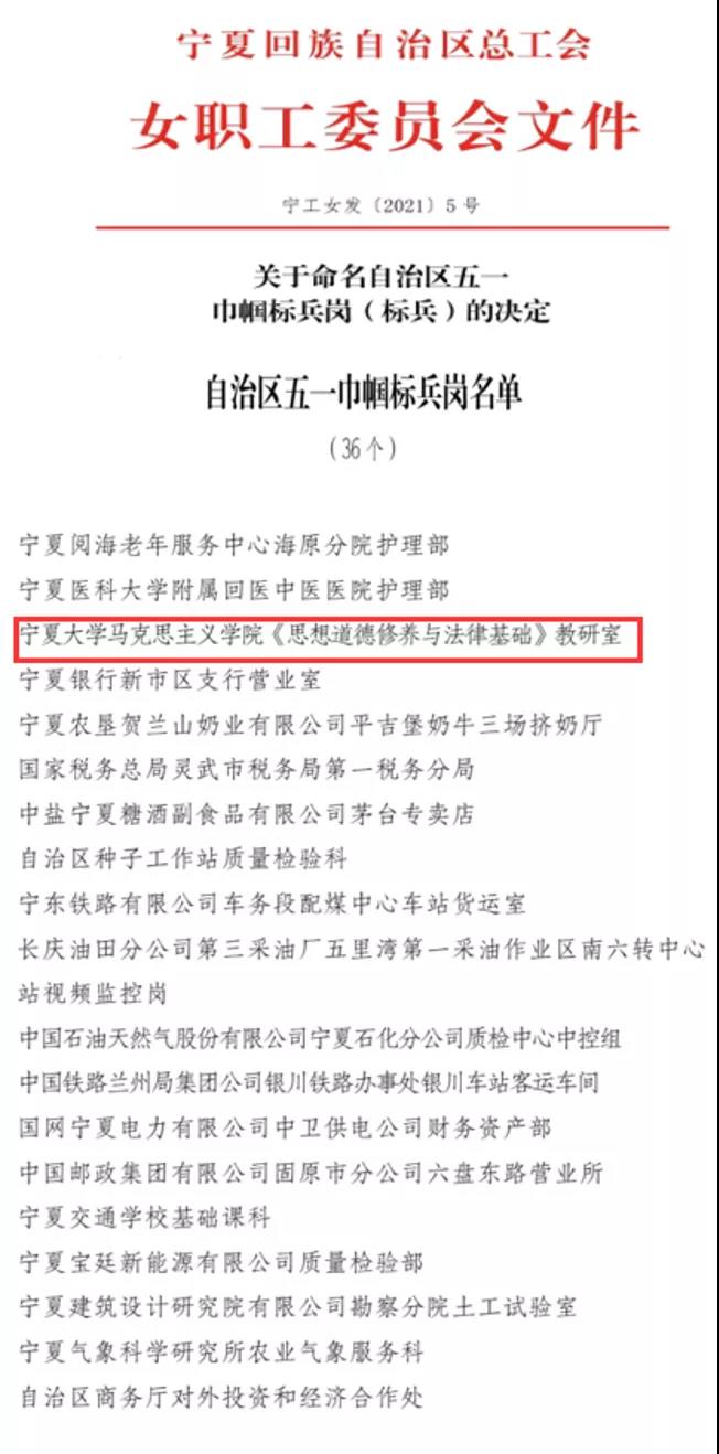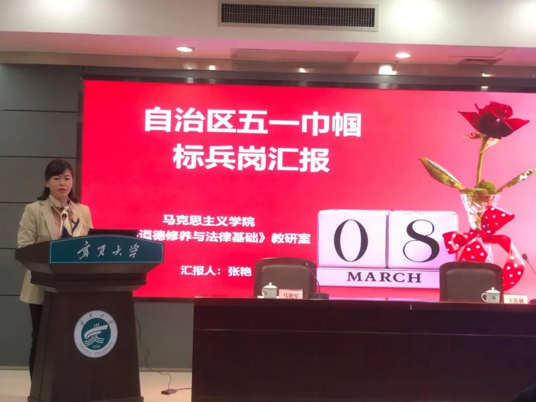 第111个国际三八妇女节到来之际,威廉希尔《思想道德修养与法律基础》教研室荣获自治区总工会女职工委员授予的“自治区五一巾帼标兵岗”荣誉称号。我院党委副书记张艳作为《思想道德修养与法律基础》教研室团队代表进行了经验交流,展现了教研室女教师巾帼不让须眉的靓丽风采。
